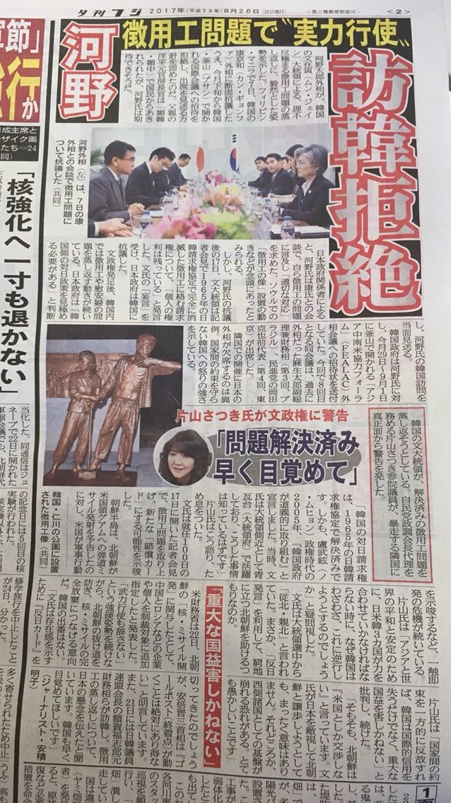 本日の夕刊フジに「片山さつき氏が文政権に警告」の記事が記載されました